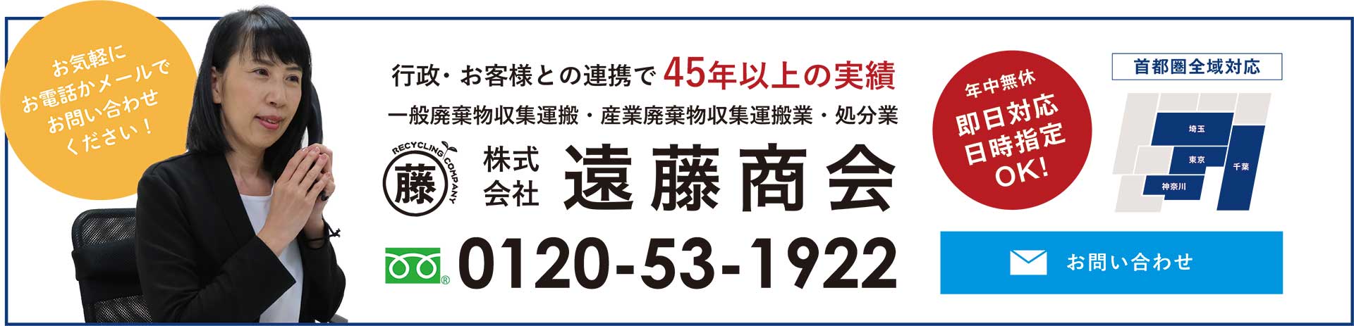 どこに頼んだらいいのかお困りの方必見!当社は45年以上の実績と高いリサイクル率を実現した中間処理工場と広域エリアをカバーできる行政許可証を保有しており、お客様それぞれの諸事情にそった不用品回収を行い適正処理いたします。お客様満足度120%を目指し、早く・いつまでに・大量回収など様々なお客様のご要望に柔軟に対応いたします。